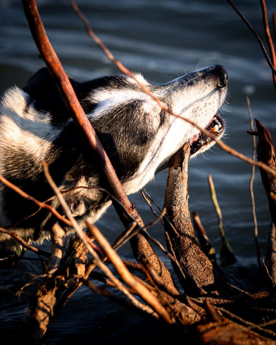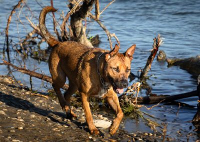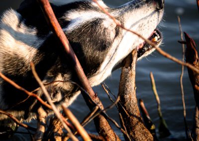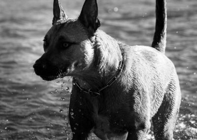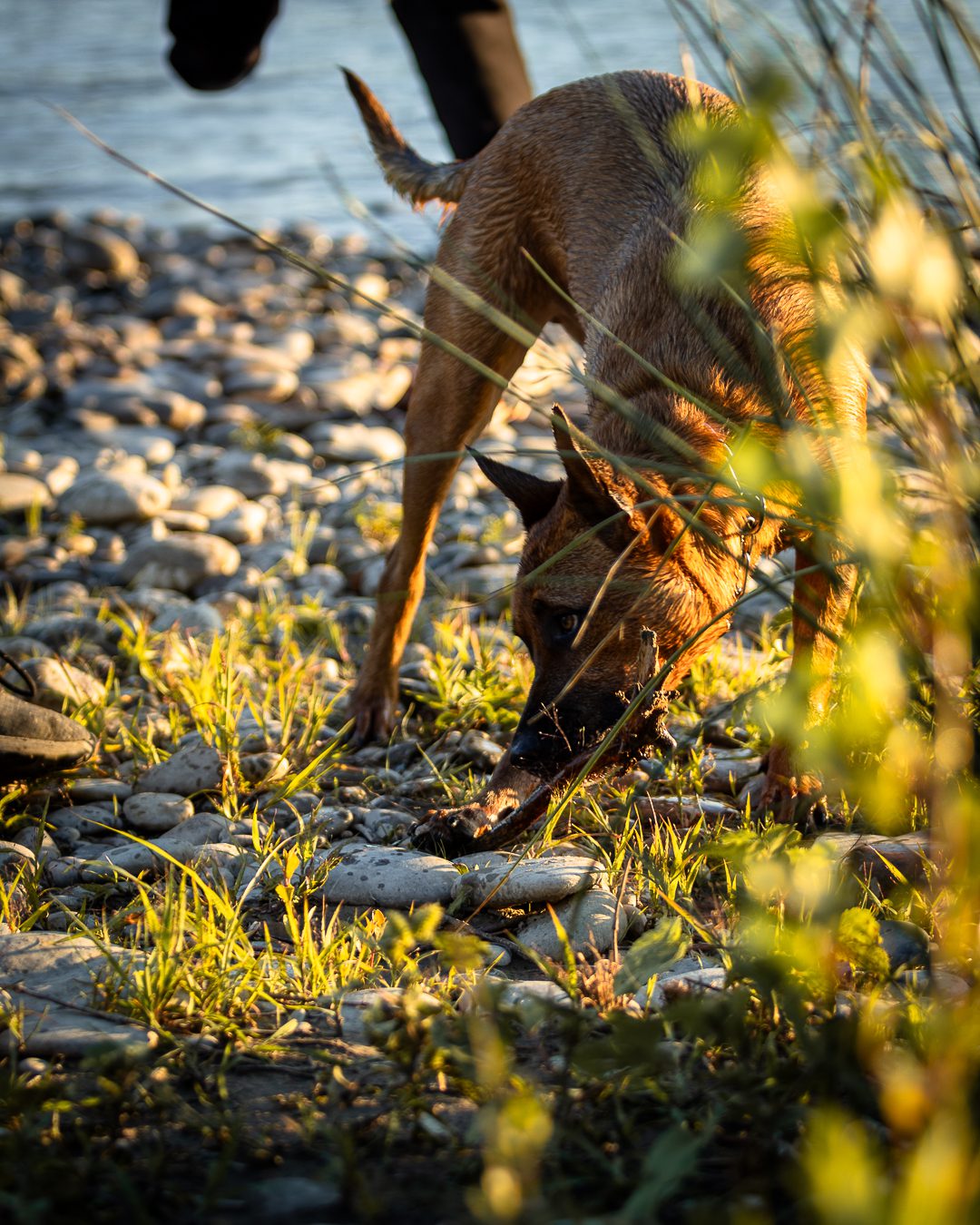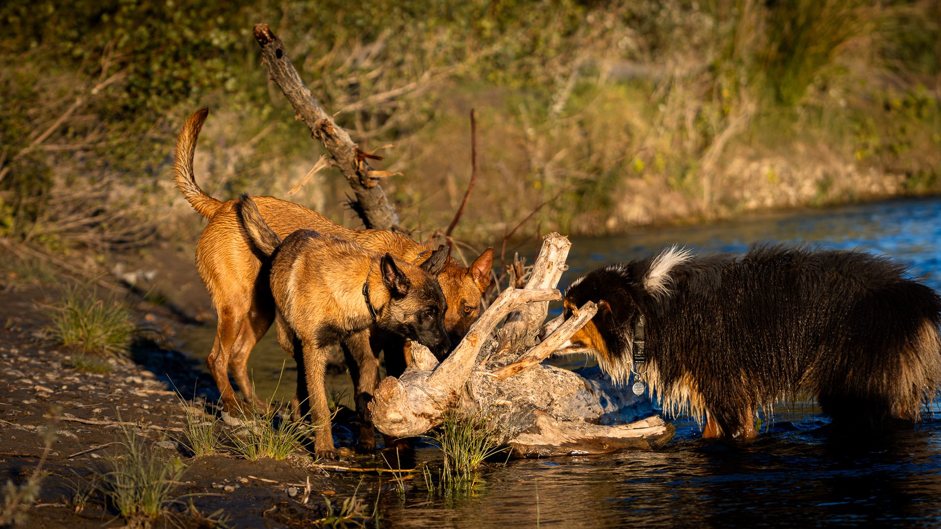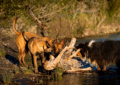 C’était donc le moment parfait pour une séance photo improvisée avec nos amis à quatre pattes. Lors de la première soirée, un Malinois et plusieurs chiens de berger jouaient joyeusement au bord de l’eau, partageant un grand bâton qu’ils avaient trouvé. Leurs mouvements étaient fluides et naturels, capturant l’essence même de la liberté et de la joie.