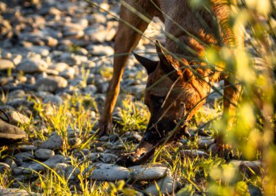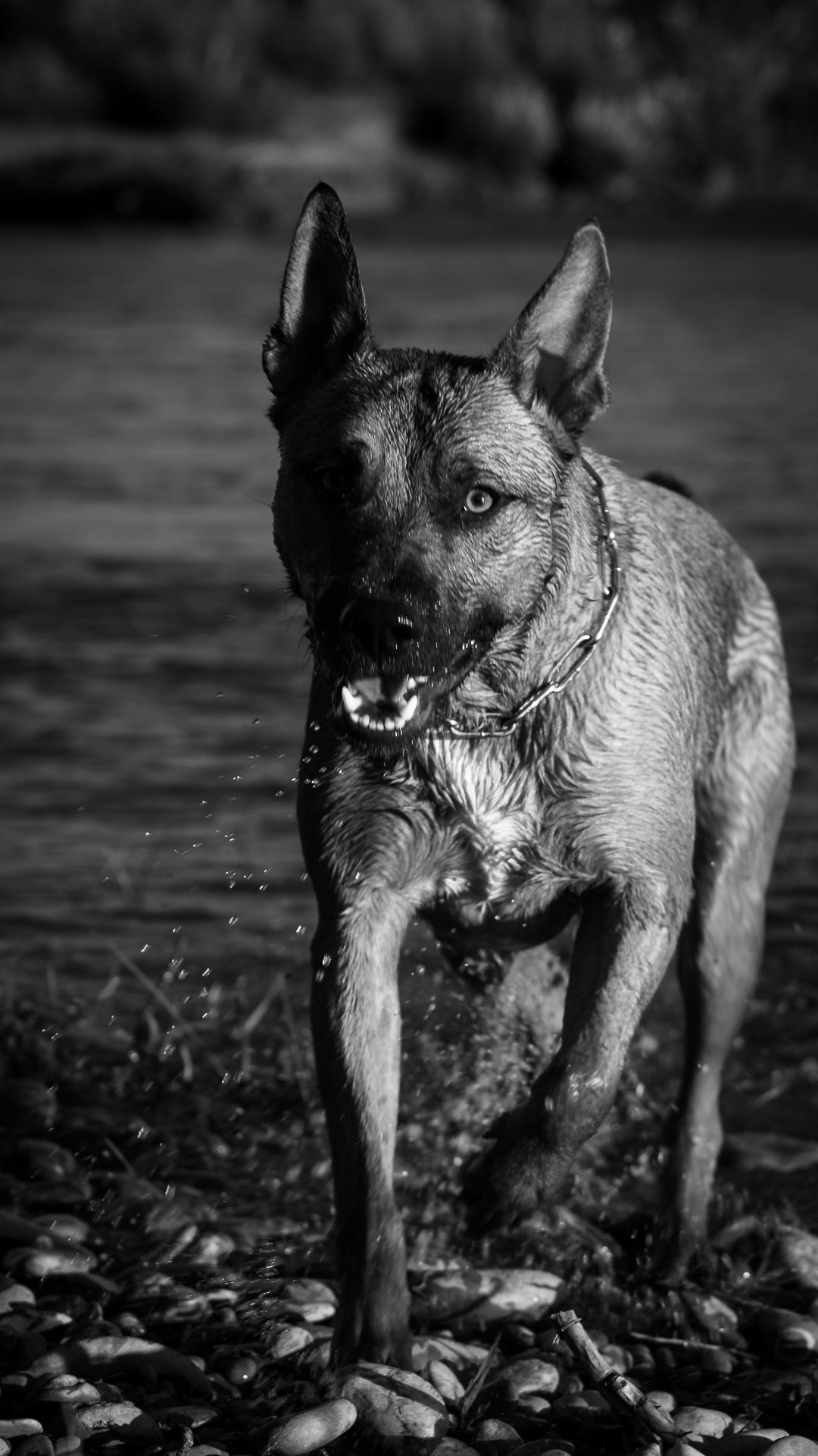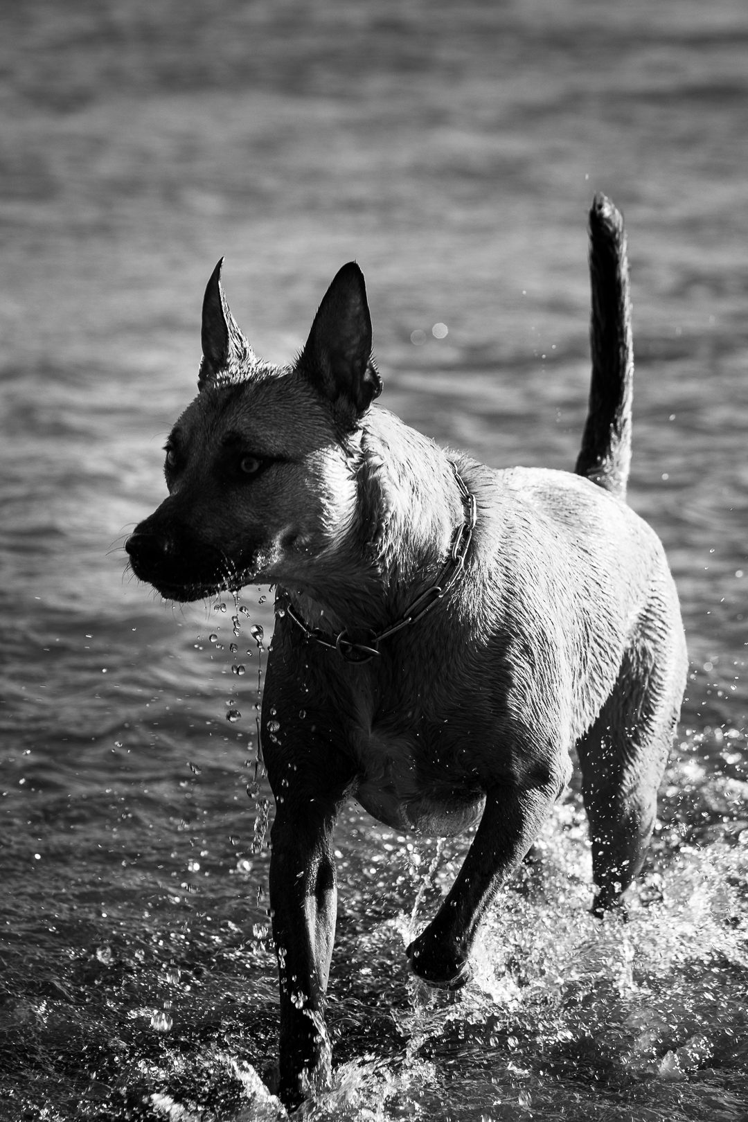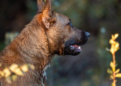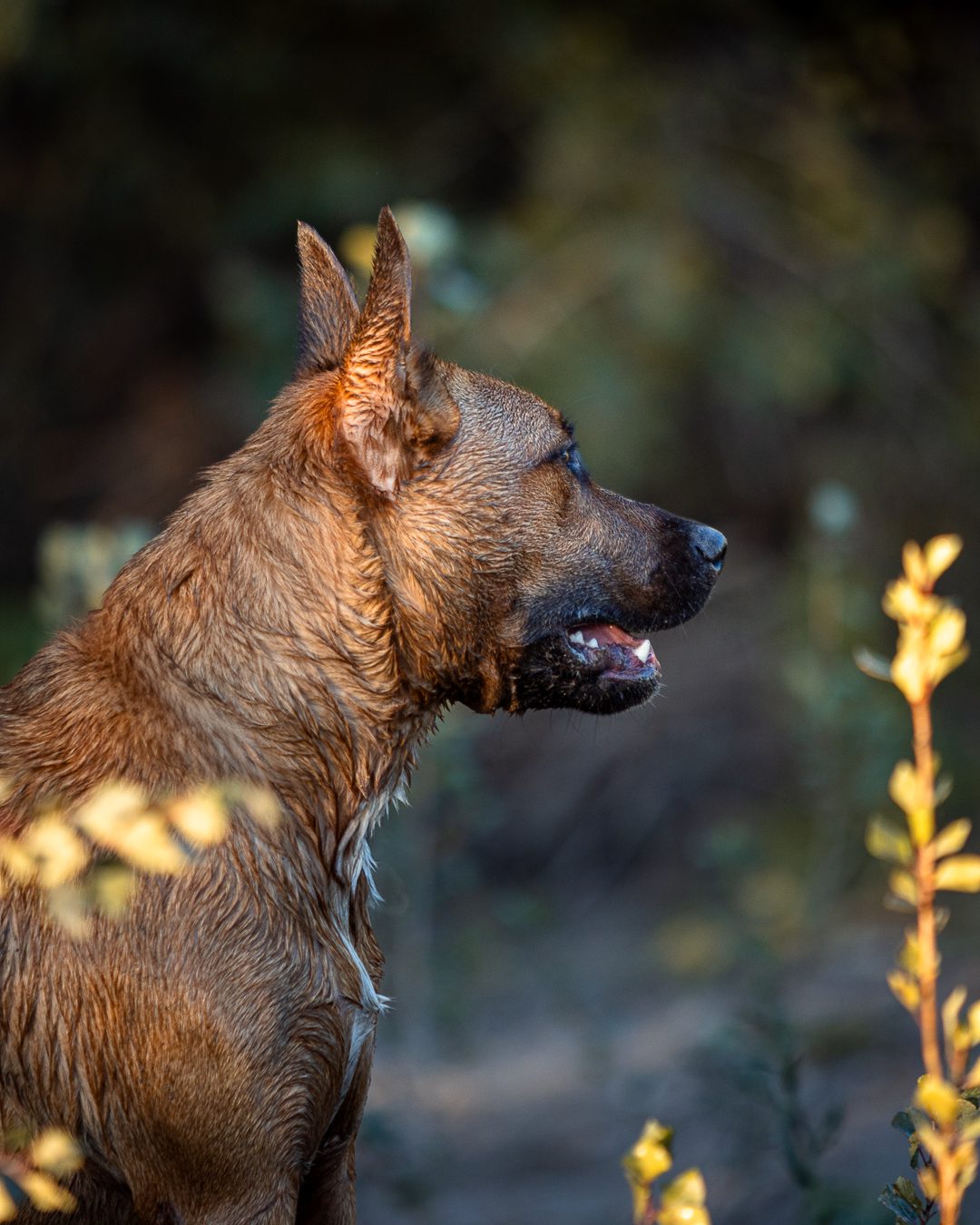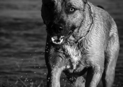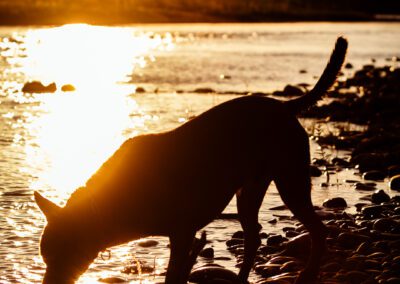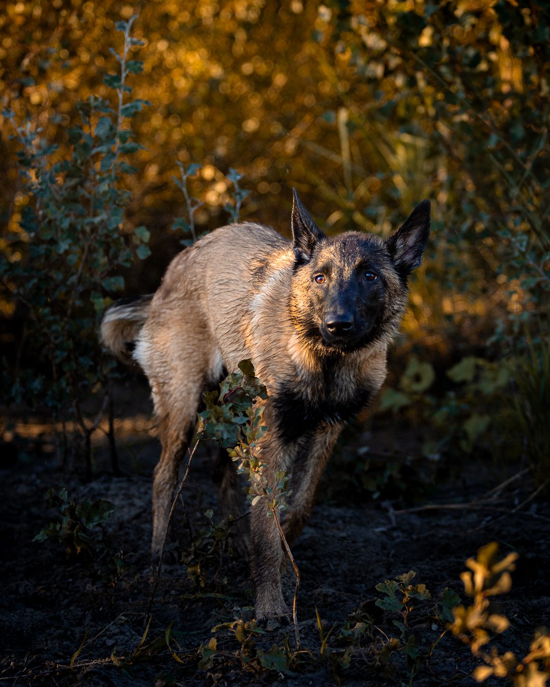 C’était donc le moment parfait pour une séance photo improvisée avec nos amis à quatre pattes. Lors de la première soirée, un Malinois et plusieurs chiens de berger jouaient joyeusement au bord de l’eau, partageant un grand bâton qu’ils avaient trouvé. Leurs mouvements étaient fluides et naturels, capturant l’essence même de la liberté et de la joie.