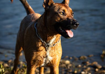 Le début de soirée approchait, et la lumière dorée du soleil couchant enveloppait la Durance d’une magie particulière. Cette séance photo chien en extérieur illustre parfaitement pourquoi je privilégie les séances photographe animalier en fin de journée dans la région d’Aix-en-Provence.