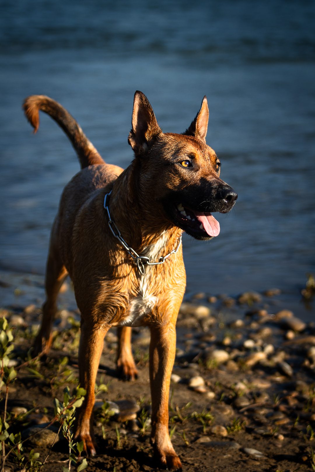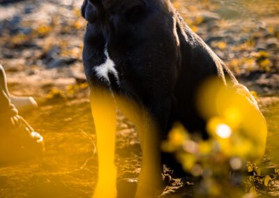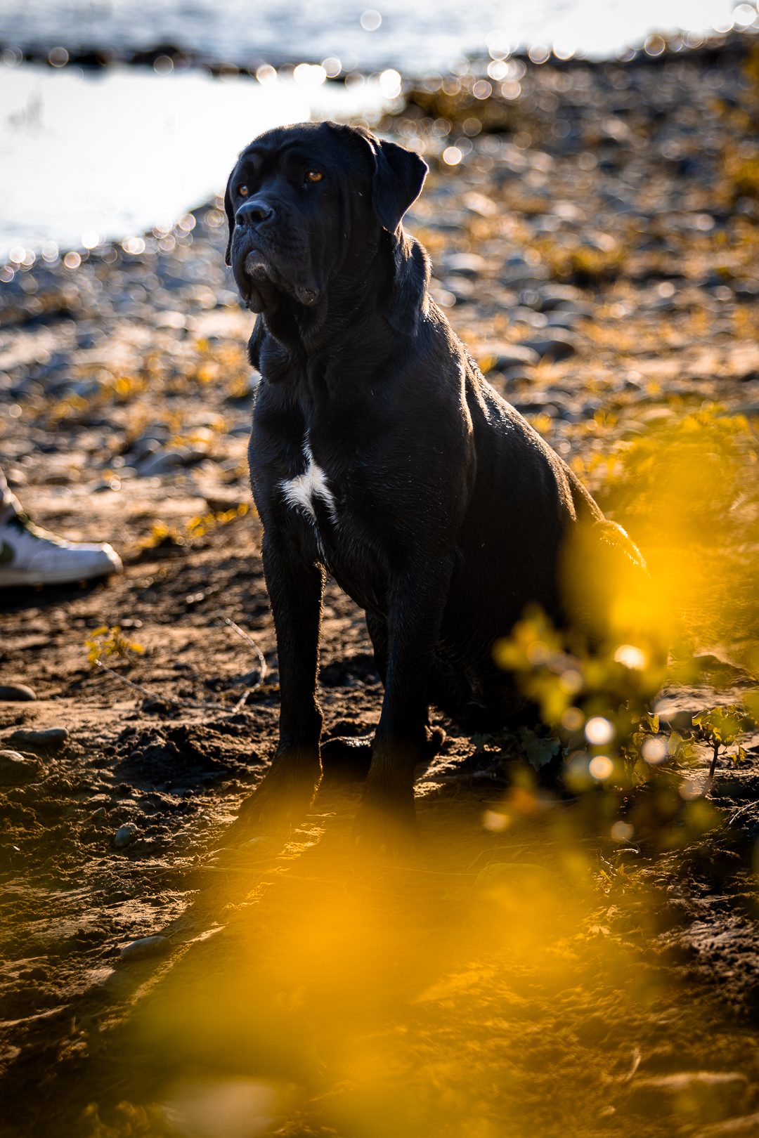Lors de la deuxième soirée, un Cane Corso majestueux et un berger croisé husky se sont joints à nous. Le Cane Corso, avec sa silhouette imposante, se tenait fièrement au bord de l’eau, observant attentivement les environs. Le berger croisé husky, avec son pelage épais et ses yeux perçants, apportait une énergie nouvelle à la scène. Ces deux chiens, bien que différents, partageaient une complicité évidente, créant des moments de jeu et de réflexion qui étaient un plaisir à photographier.